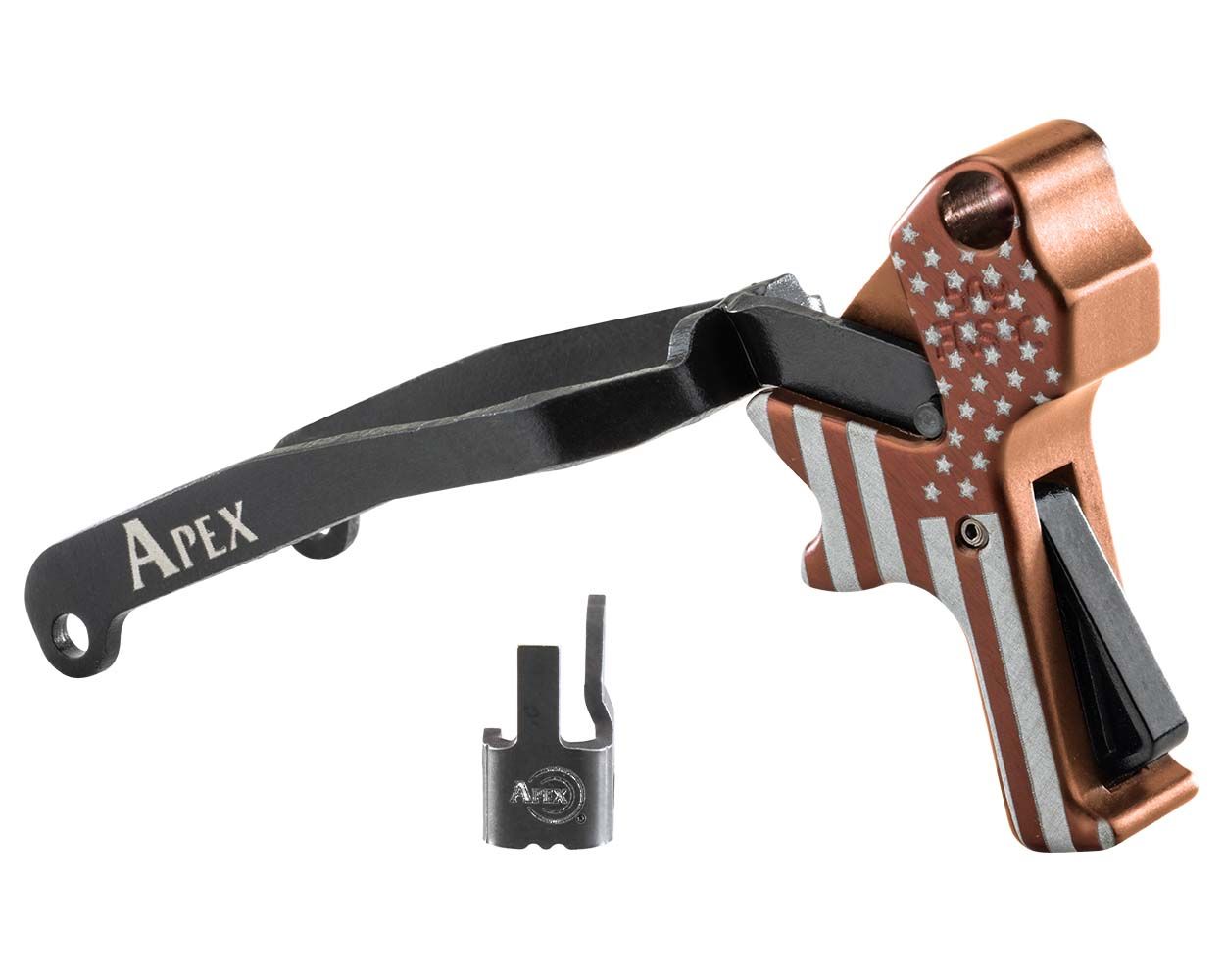 - Apex Classic Trigger: Features a smooth, flat face with radiused front corners. The visible sides are flat with no decorative cuts, giving it a clean, understated look. Ideal for shooters who prefer a simple, functional design.