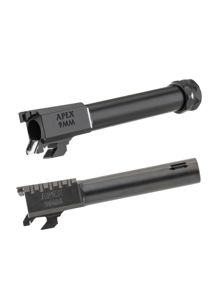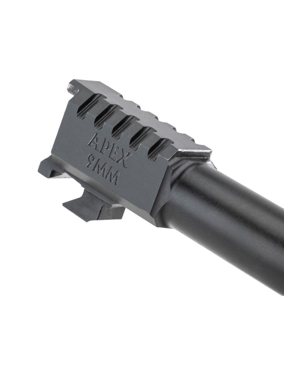 The barrel is finished with Black Melonite, a surface treatment that increases hardness and corrosion resistance. This keeps the bore and exterior protected from moisture, cleaning solvents, and holster wear. Every barrel is 100% manufactured in the USA at the Apex facility in Phoenix, Arizona. This means tighter quality control and a product built to consistent specifications.