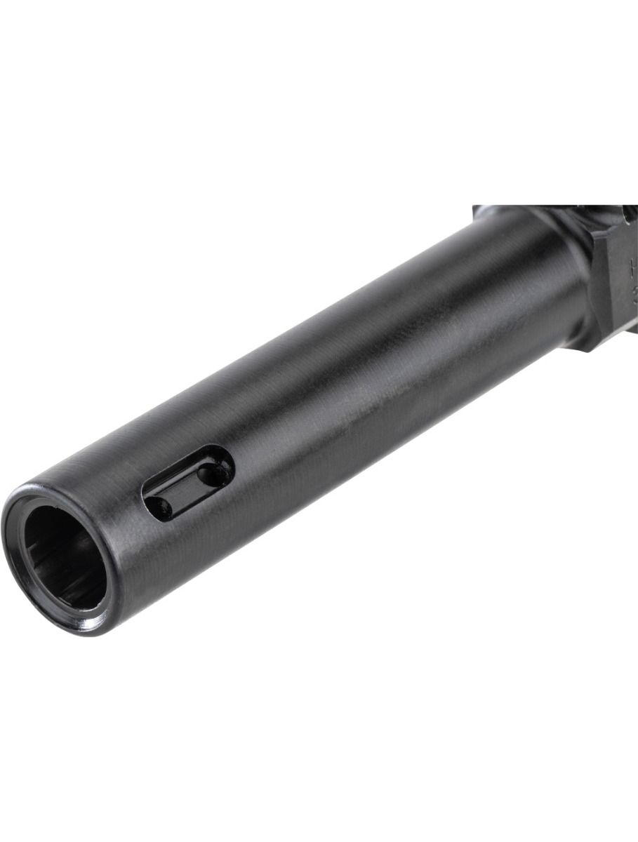 The porting on this barrel is the key functional feature. Small holes are precision-drilled along the bore near the muzzle. When you fire, those holes vent high-pressure gas upward, which pushes the front of the pistol down against the natural upward motion of recoil. The result is noticeably less muzzle flip and reduced felt recoil. This keeps your sights on target faster for the next shot, which is a real advantage in defensive training or range practice. The barrel also features chamber corner serrations. While they add a visual detail, their practical benefit is giving you a better gripping surface if you ever need to check or clear the chamber.