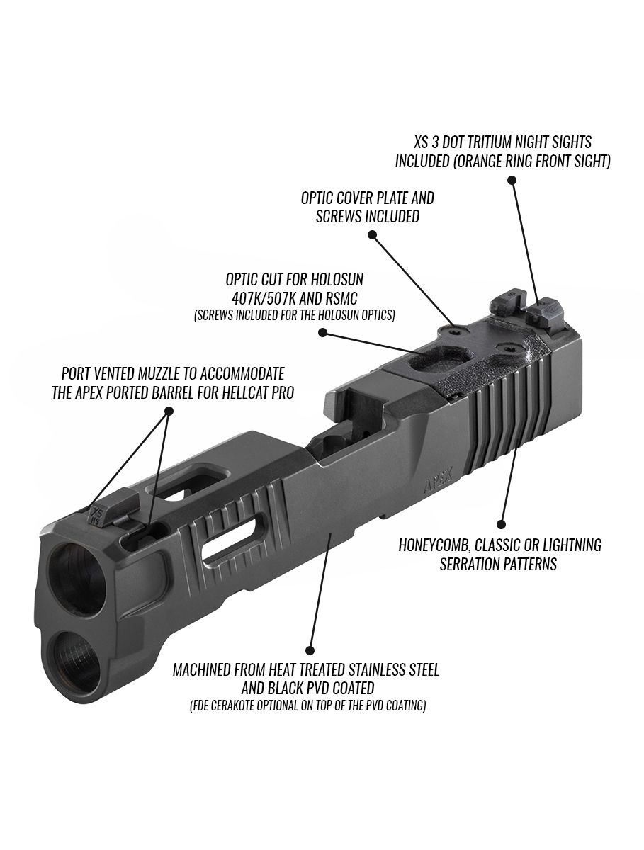 The Apex Slide for the Springfield Hellcat and Hellcat Pro is machined from heat-treated stainless steel, right here in Phoenix, AZ. 100% Made in the USA, this slide is built for durability and precision. It is compatible with all Apex aftermarket Hellcat and Hellcat Pro slide components and barrels, as well as all factory Hellcat slide internals. This is a “partially stripped” slide, meaning you will need to provide all of the slide internals, including the barrel and recoil assembly.