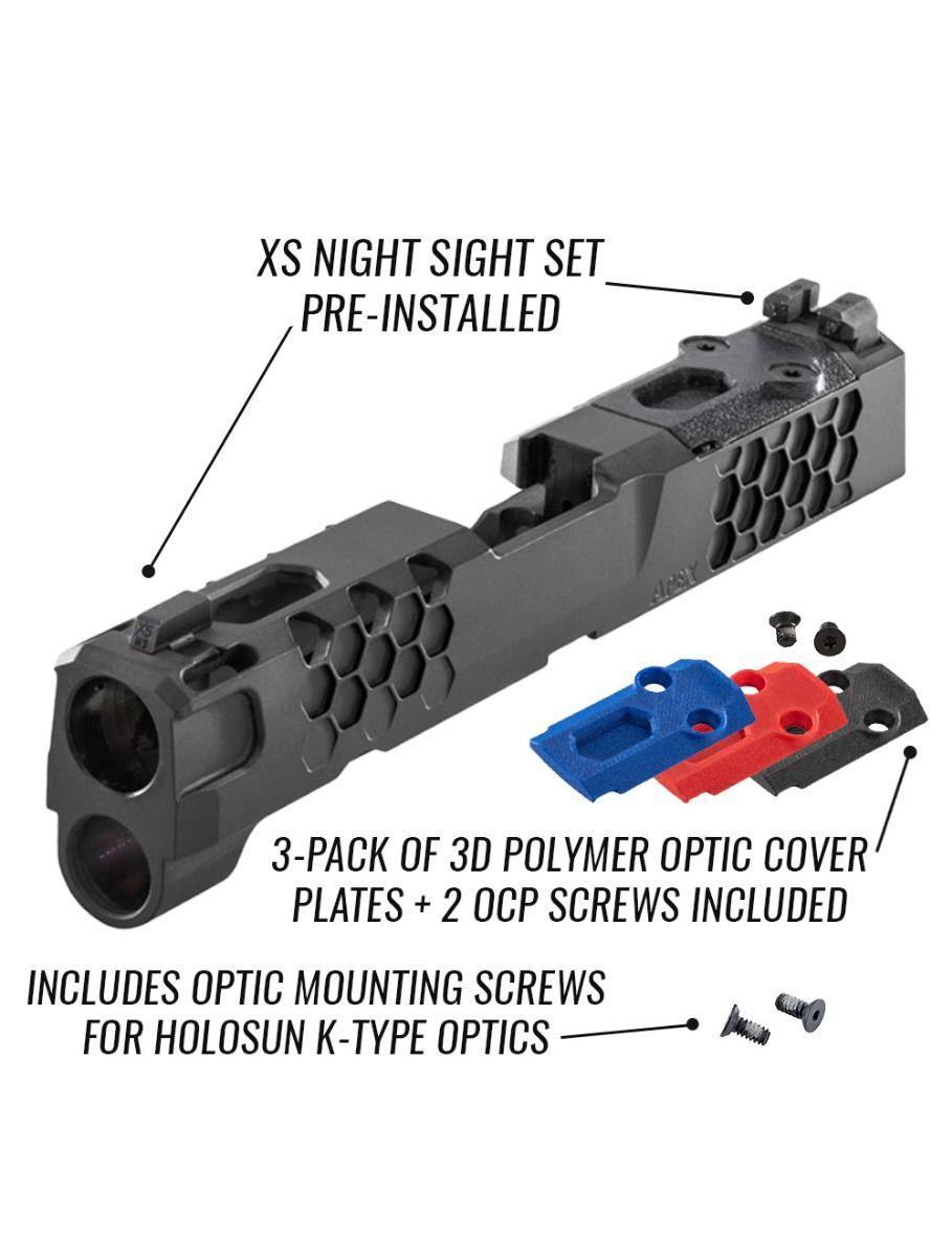 Optic Mount Cut: The slide is machined with an optic cut specifically for Holosun K Series optics, including the 407K, 507K, EPS, and EPS Carry models. It also fits Shield Arms RMSC optics (use the screws included with the RMSC optic). Optic mounting screws for Holosun K Type optics are included. The optic mount holes are 4mm x .7mm with 4+ threads to ensure maximum optic holding power.