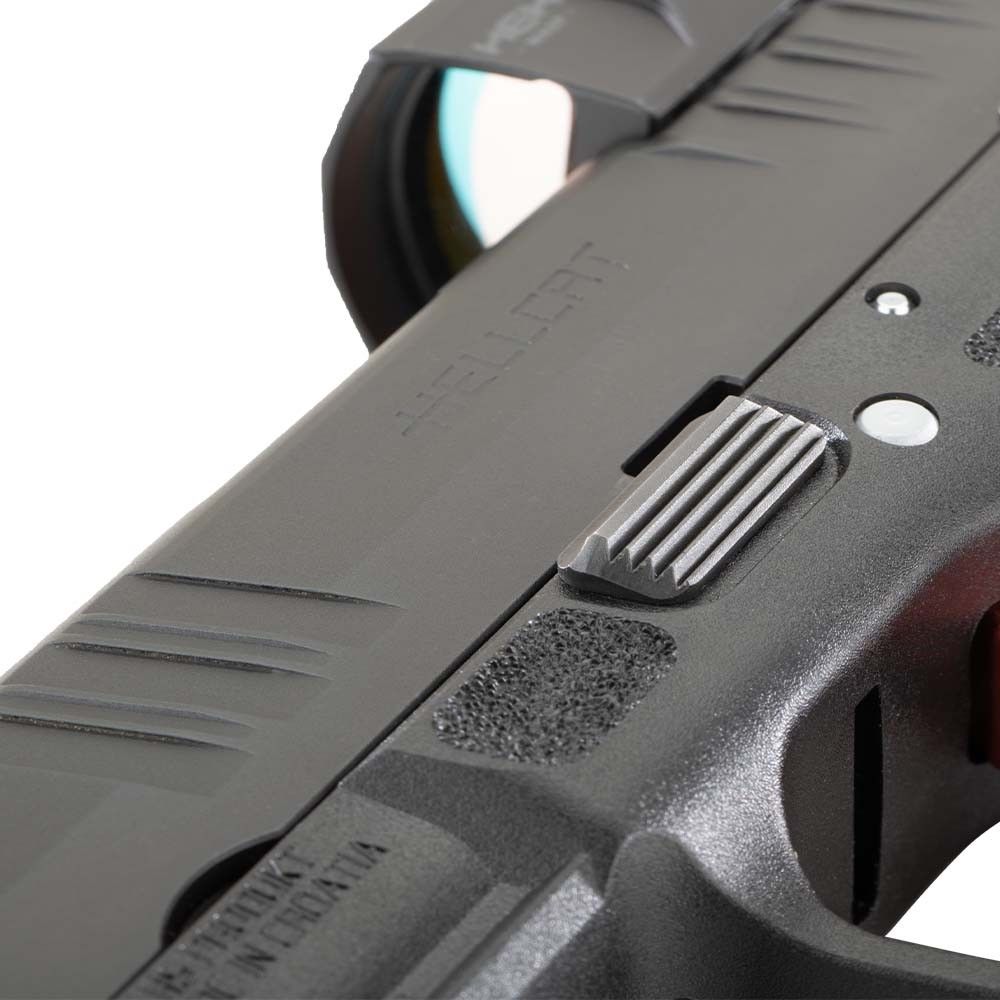 Field stripping also becomes noticeably easier. The extended face gives you a larger surface to press down on when rotating the lever, which is especially helpful if you have larger hands or wear gloves. The serrated texture ensures your thumb won’t slip, even when your hands are sweaty or oily. This is a real time-saver for regular cleaning and maintenance, which is essential for keeping your Hellcat reliable over thousands of rounds.