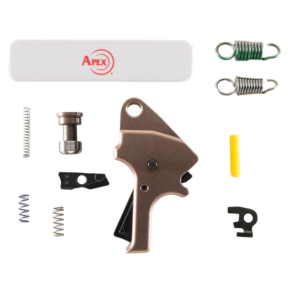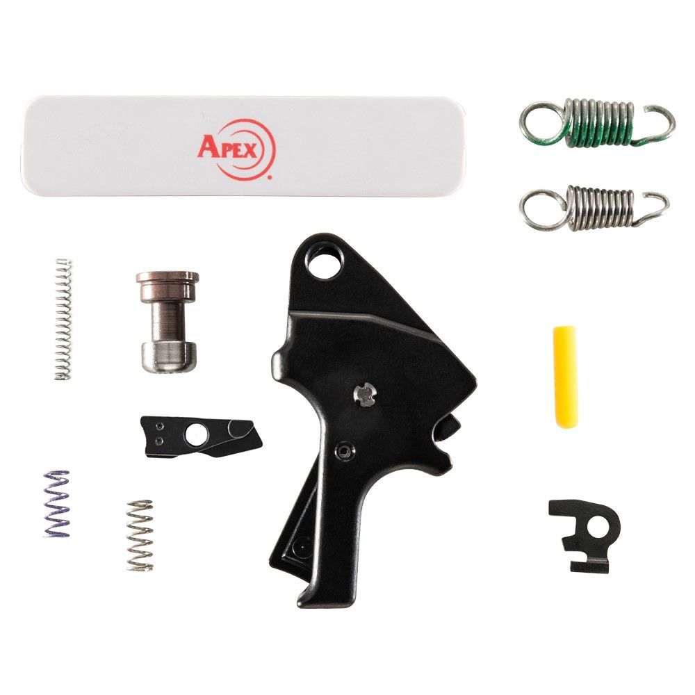 Everything you need is in the box. The kit uses a combination of Apex springs with your factory sear and trigger return springs, allowing you to fine-tune the pull weight within a range suitable for duty, carry, or competition. All parts are direct drop-in replacements. No filing, sanding, or fitting is needed. The center-mounted pivoting safety maintains the same factory safety values, so you can install with confidence.