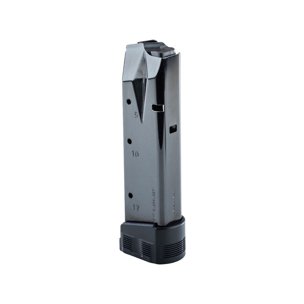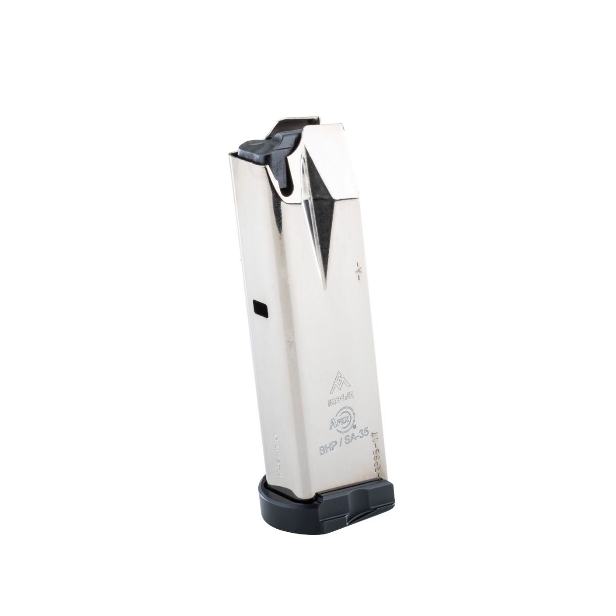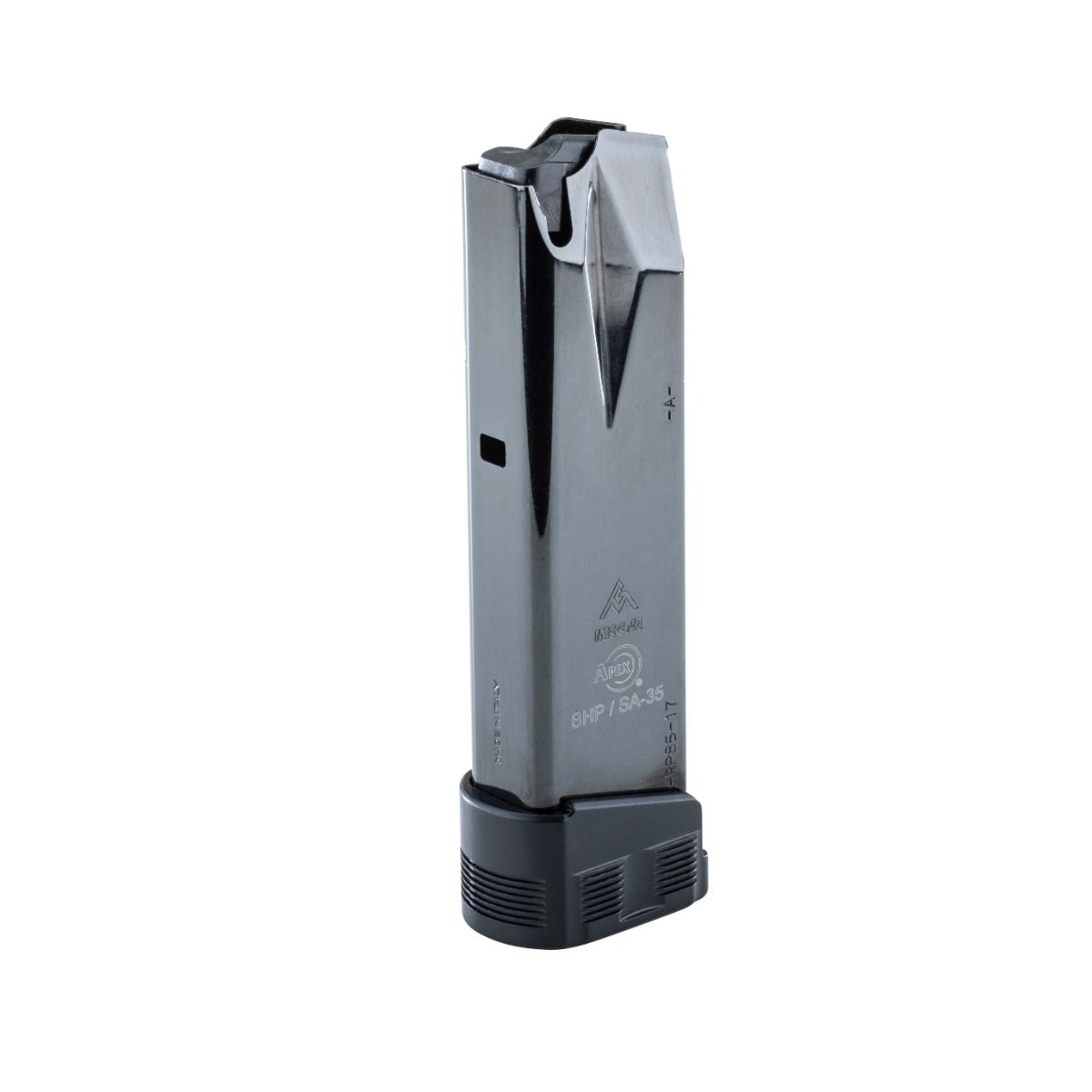 This magazine is purpose-built for the Springfield Armory SA-35 pistol equipped with an Apex Tactical Magazine Well. It replaces the standard 15-round factory magazine, offering a choice of 17 or 19 rounds while maintaining reliable feeding with quality domestic ammunition. The base pad is contoured to blend seamlessly with the frame, and integrated grasping surfaces allow for positive emergency magazine extraction from the pistol.